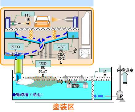 在涂装车间进行喷漆涂装时,都采用喷漆循环水槽处理方式,使过喷的油漆进入水溶液中,容易造成管路堵塞及泵和叶片超负荷运转,增加清理难度和费用。因此采用往循环水中添加油漆絮凝剂,通过凝集、过滤的方式排出油漆残渣。